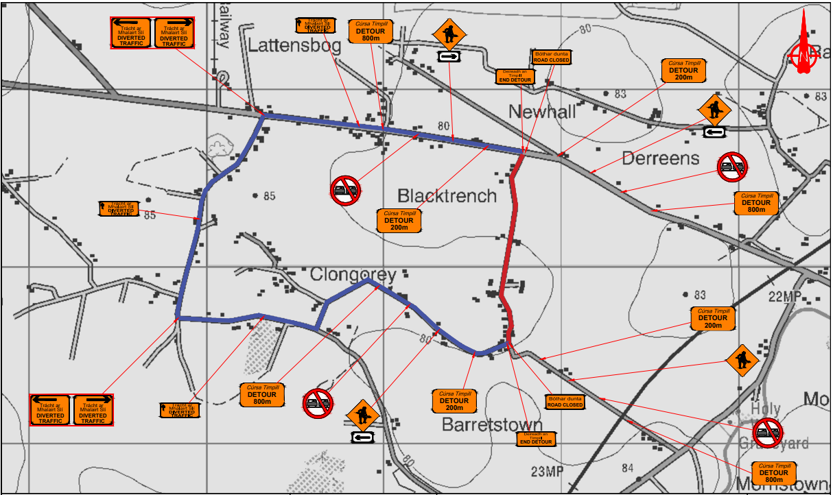 Diversionary routes will be clearly signposted, as agreed with the Council and An Garda Síochána. Emergency access and restricted local access will be maintained.