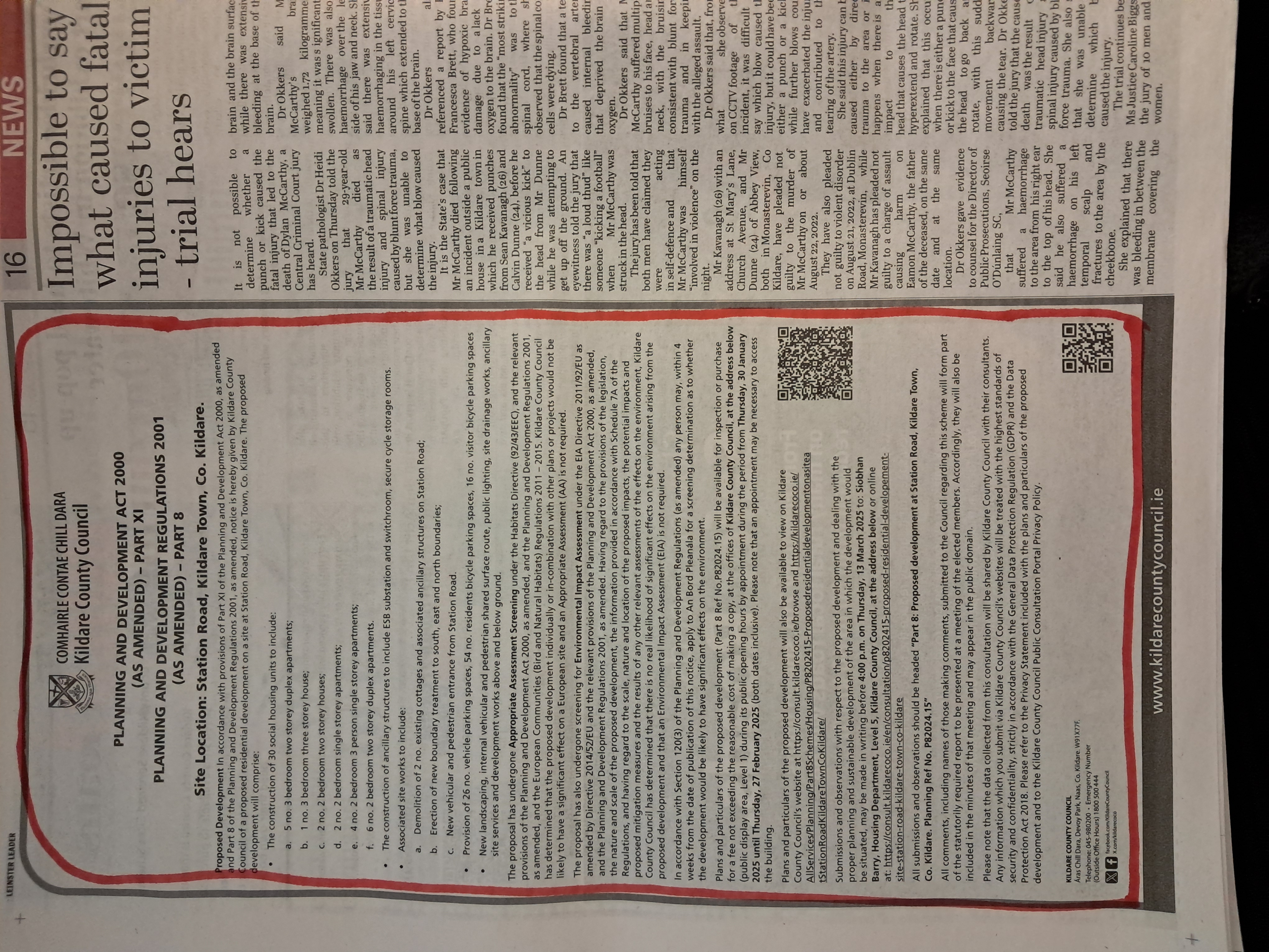 The proposal has also undergone screening for Environmental Impact Assessment under the EIA Directive 2011/92/EU as amended by Directive 2014/52/EU and the relevant provisions of the Planning and Development Act 2000, as amended, and the Planning and Development Regulations 2001, as amended. Having regard to the provisions of the legislation, the nature and scale of the proposed development, the information provided in accordance with Schedule 7A of the Regulations, and having regard to the scale, nature and location of the proposed impacts, the potential impacts and proposed mitigation measures and the results of the any other relevant assessments of the effects on the environment, Kildare County Council has determined that there is no real likelihood of significant effects on the environment arising from the proposed development and that an Environmental Impact Assessment (EIA) is not required. In accordance with Section 120(3) of the Planning and Development Regulations (as amended) any person may, within 4 weeks from the date of publication of this notice, apply to An Bord Pleanála for a screening determination as to whether the development would be likely to have significant effects on the environment. Plans and particulars of the proposed development Ref No P82024.15 including the AA and EIA Screening Reports and a record of the main reasons and considerations supporting the determination not to require an EIA and AA will be available for inspection and/or purchase at a fee not exceeding the reasonable cost of making a copy at Public Display Area, Level 1, Kildare County Council, Devoy Park, Naas Co Kildare, W91 X77F on each day during which the said offices are open for the transaction of business (excluding Bank Holidays) for a period beginning on 30.01.2025 and ending on 27.02.2025 during office hours. Plans and particulars of the proposed development including the AA and EIA Screening Reports and a record of the main reasons and considerations supporting the determination not to require an EIA and AA will also be available online at https://consult.kildarecoco.ie/browse and https://kildarecoco.ie/AllServices/Planning/Part8Schemes/Housing/P8202415‐ ProposedresidentialdevelopmentonasiteatStationRoadKildareTownCoKildare/ Submissions or observations with respect to the proposed development, dealing with the proper planning and sustainable development of the area in which the development would be situated, may be made in writing to Siobhan Barry, Administrative Officer, Housing Capital Team, Level 5, Aras Chill Dara, Devoy Park, Naas Co Kildare, W91 X77F or online via https://consult.kildarecoco.ie. Submissions must be made no later than 4.30pm on 13/03/2025. Submissions should be titled “Part 8: Proposed development at Station Road, Kildare Town, Co. Kildare. Planning Ref No. P82024.15” All comments, including the names of those making comments submitted to the Council in regard to the scheme as outlined above, will form part of the statutorily required report to be presented at a meeting of the elected members. Accordingly, they will also be included in the minutes of that meeting and may appear in the public domain. Please note that the data collected from this consultation will be shared by Kildare County Council with their Consultants. Any information which you submit via Kildare County Council's website will be treated with the highest standards of security and confidentiality, strictly in accordance with the General Data Protection Regulation (GDPR) and the Data Protection Act 2018. Please refer to the Privacy Statement included with the plans and particulars of the proposed development and to the Kildare County Council Consultation Portal Privacy Policy.