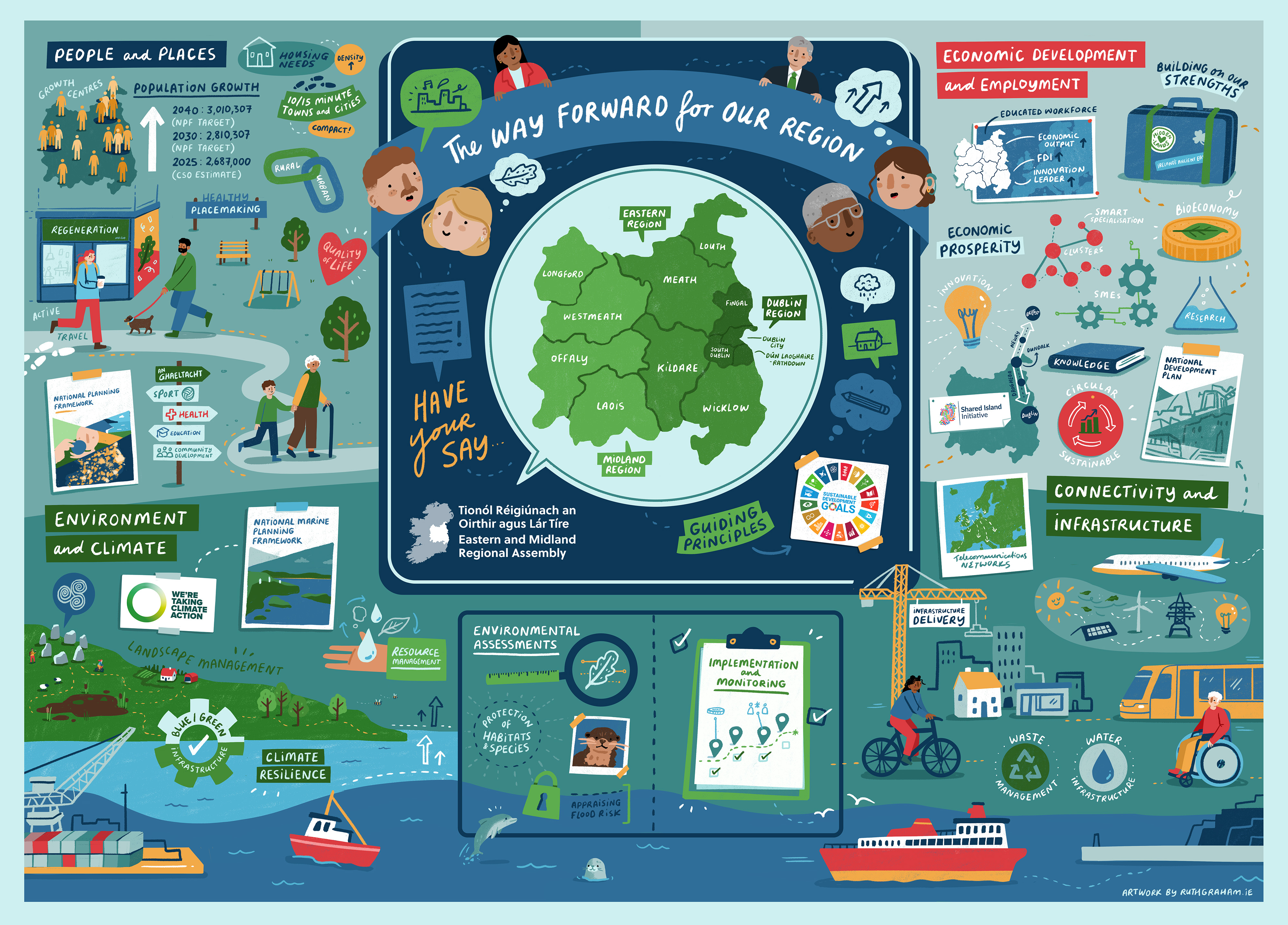The Eastern and Midland Regional Assembly are at the earliest stage of reviewing the Regional Spatial and Economic Strategy (RSES) and are seeking input from communities, stakeholders and all interested parties on the future of our region. Your feedback will help shape the preparation of a new draft RSES that supports sustainable social, environmental and economic development for everyone.