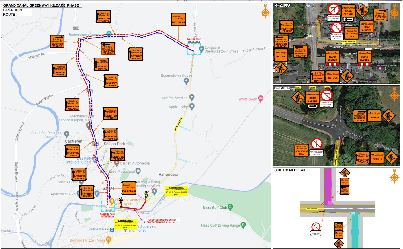 A diversion route shall be provided from Sallins via the R407 to the junction with the L1210 at Castlesize Green, then via the L1210, passing Bodenstown Graveyard and ending at Sherlockstown Cross.