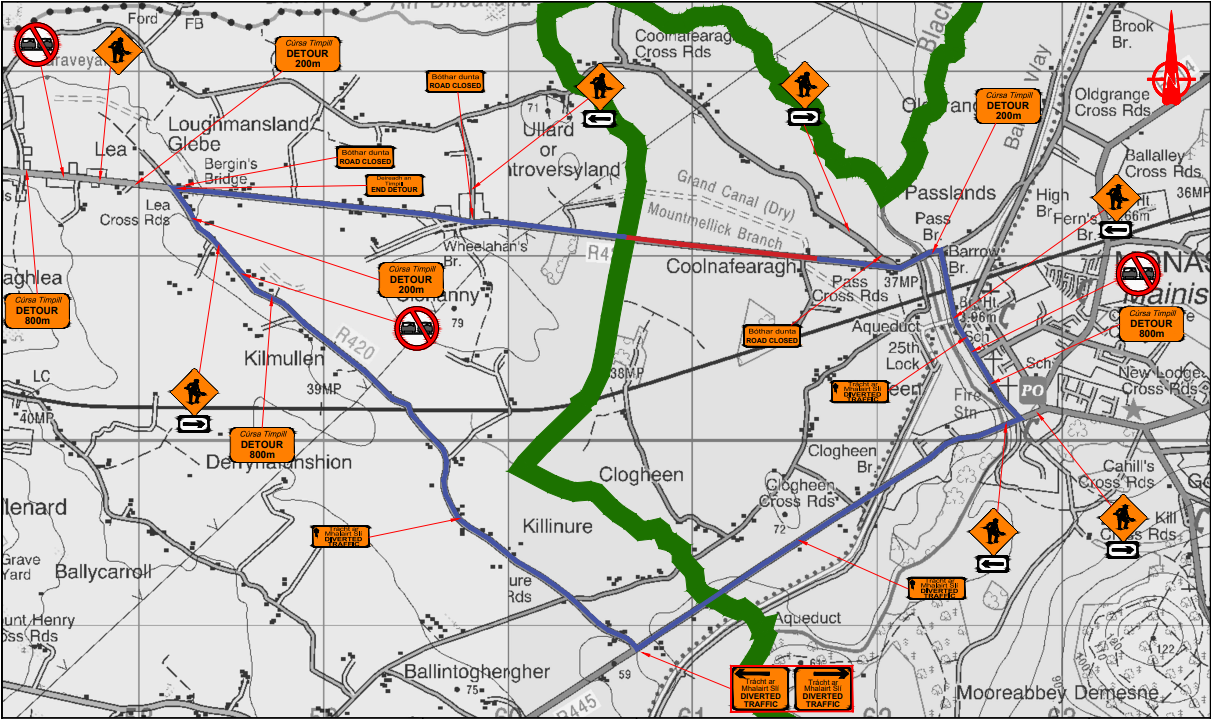 Travel along the R424 into Monasterevin through the Main Street to the junction of the R424/R445.Turn right and travel out of Monasterevin on the R445 to the junction of the R445/R420. At this junction turn right onto the R420 and travel northbound to Lea Crossroads where the diversion ends.