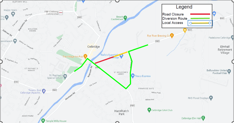 Southbound vehicles from Celbridge Main Street & Eastbound vehicles from Clane (Liffey Bridge) will be diverted onto the R405 (Hazelhatch Rd.) as far as Shinkeen Rd. where it will divert left. They will continue on the Shinkeen Rd. (circa 0.5km) & divert right back onto the R403.