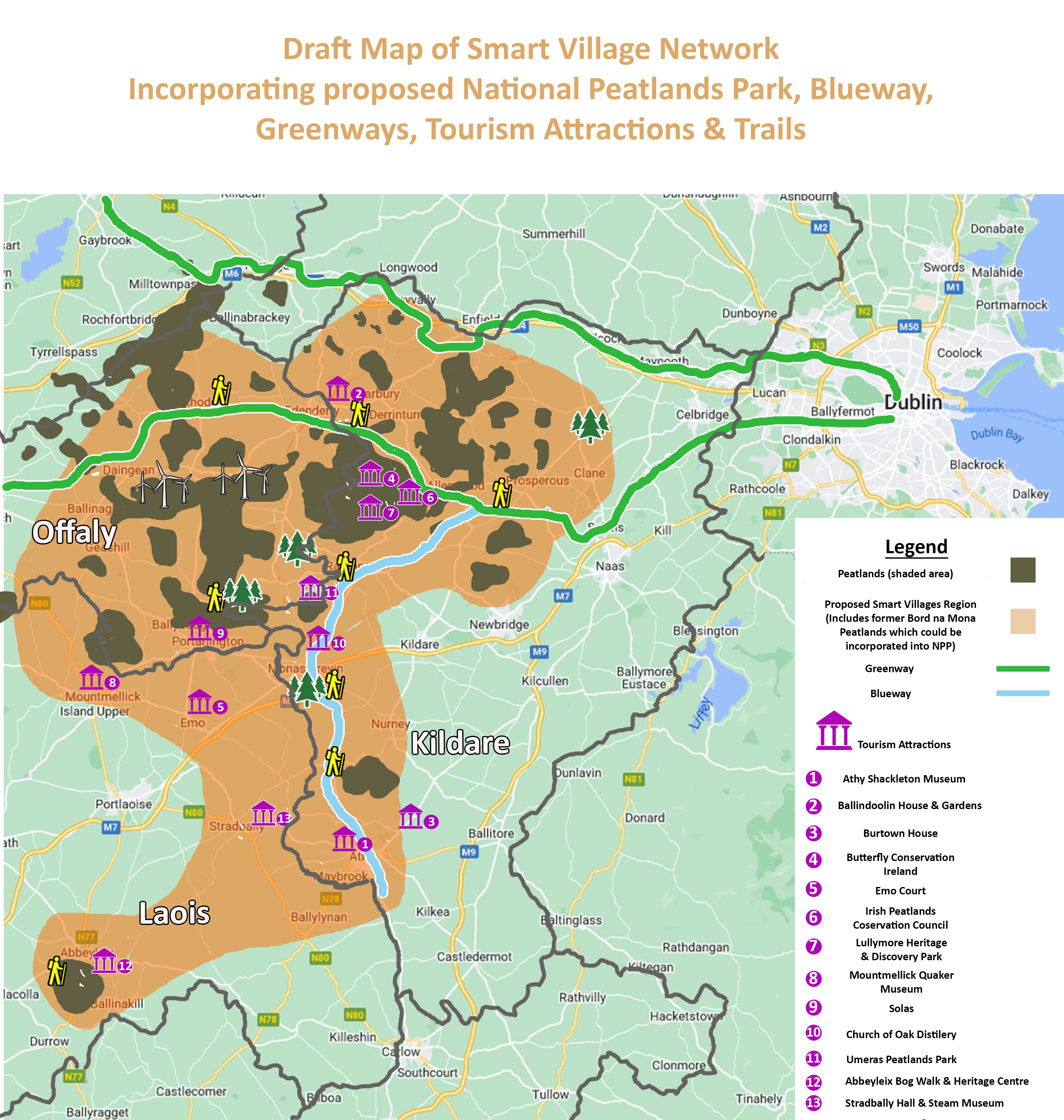 Support the West Kildare Smart Rural Alliance and access for peatland communities to the European Network for Rural Development's Smart Village initiative in conjunction with Offaly County Council, Laois County Council, Leader companies in each county and all other relevant stakeholders.